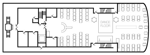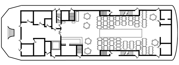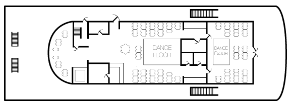 The Covington Deck is the second deck of The Belle of Cincinnati and has a seated capacity of 300. It features two large dining areas separated by a dance floor and a full bar. Restroom facilities and elevator access are both available as well as a gift shop. Our Covington Deck hosts most of our public dining cruises.